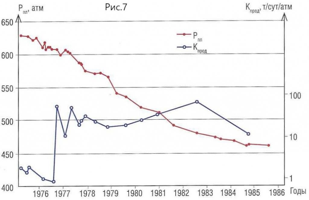 Рис. 7. Динамика пластового давления и коэфициента продуктивности по скважине,эксплуатирующей трещинный коллектор