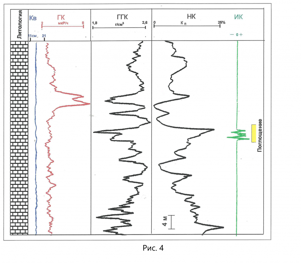 Если скважина заполнена промывочной жидкостью, не проводящей электрический ток, то применяется индукционный каротаж (ИК). Использование ИК в таких случаях основано на результатах решения прямой задачи теории индукционного каротажа для трёхмерной модели среды при наличии скважины и вертикальной трещины [3,7]. Индикатором трещин служит аномалия специфической формы на кривой электропроводимости (Рис.4).