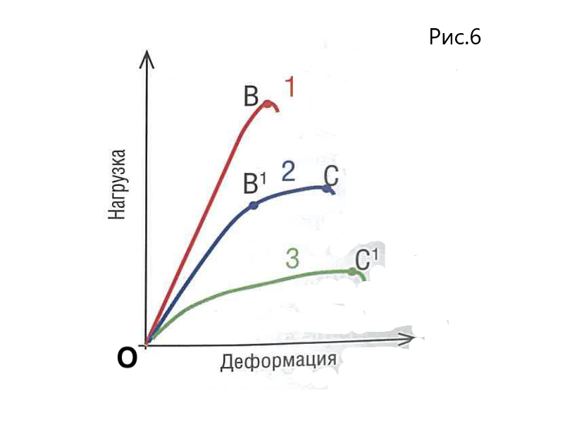 До ввода залежи в разработку и добычи нефти в трещинном коллекторе установилось начальное раскрытие трещин, определяемое превышением пластового давления над горизонтальным напряжением (Рпл>σгор). С момента начала добычи нефти и снижения пластового давления разница между Рпл и σгор также начнёт уменьшаться, что повлечёт за собой деформации пород матрицы, т.е. изменение их линейных размеров, объёма или формы. Характер и уровень деформаций зависят от типа и величины приложенных напряжений, а также от упругих и пластических свойств породы (Рис.6). Рост нагрузки вызывает рост деформаций и в пределе возникает разрушение — порода теряет свою сплошность и разделяется на части. В общем случае при увеличении нагрузки можно постепенно наблюдать три области деформаций (Рис.6) — упругую (ОВ,ОВ1), пластическую (В1С,ОС1), разрушающую (правее В,С,С1).