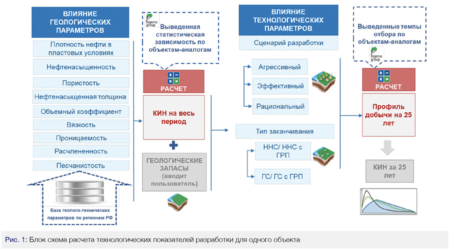 Методика расчета (см. рис.1) заключается в определении извлекаемых запасов нефти через коэффициент извлечения нефти (КИН) по статистическим зависимостям, выведенным на основе данных по месторождениям-аналогам, и профиля добычи — по темпу отбора и характеристикам вытеснения.