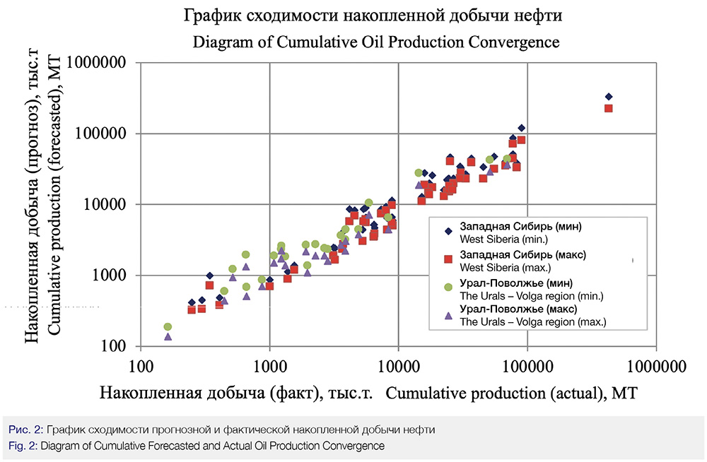 Для получения хорошей сходимости прогнозных КИН с реально достигнутыми в процессе разработки при определенных геолого-физических условиях были выделены основные факторы, влияющие на достижение КИН. Проведена настройка зависимости на ключевые показатели с небольшой относительной погрешностью. Таким образом, при вводе исходных данных объекта-аналога получается расчет КИН, близкий к фактически достигнутому по объекту-аналогу. Пример сходимости прогнозной и фактической накопленной добычи нефти приведен на рис. 2.