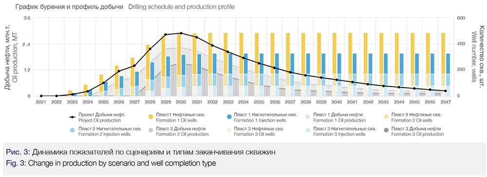 Для оценки возможной вариативности для описанного выше тестового объекта разработки была произведена серия расчетов по трем сценариям (рациональный, эффективный, агрессивный). По каждому сценарию рассчитаны варианты с различным типом заканчивания скважин (ННС и ГС). Год ввода объекта в разработку – 2022. По методике, описанной выше, комплексом была определена динамика добычи нефти и динамика фонда добывающих и нагнетательных скважин по годам.