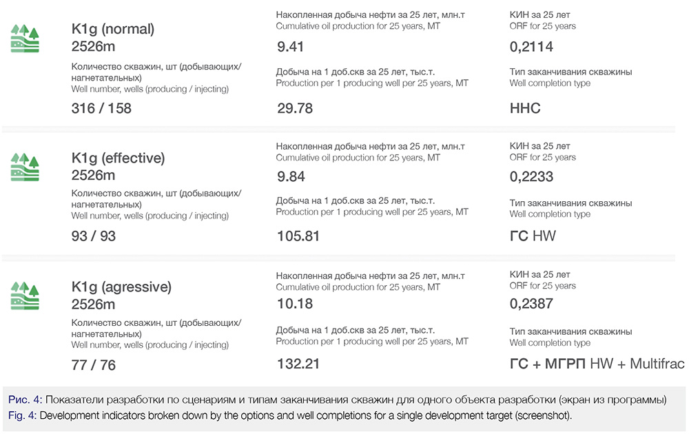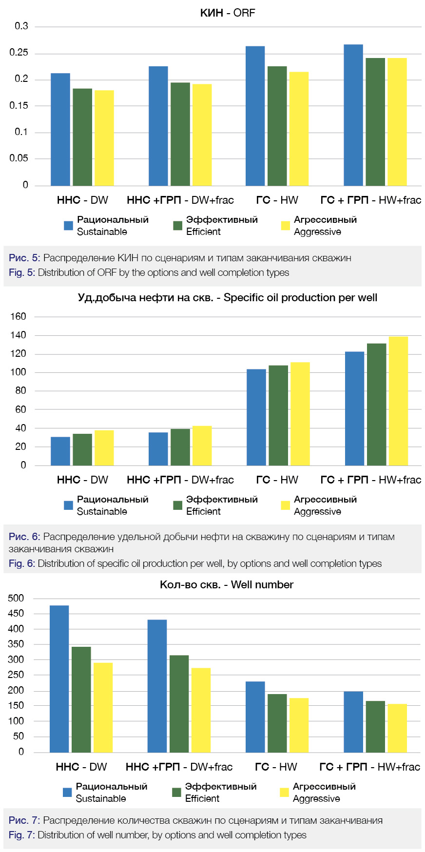Результаты расчетов по каждому сценарию сводятся автоматизированным комплексом в графическое представление, демонстрирующее ключевые показатели разработки: фонд скважин (добывающих / нагнетательных), накопленная добыча нефти за 25 лет, удельная добыча нефти на скважину, тип заканчивания скважин, а также КИН достигаемый за 25 лет разработки (Рис .4).