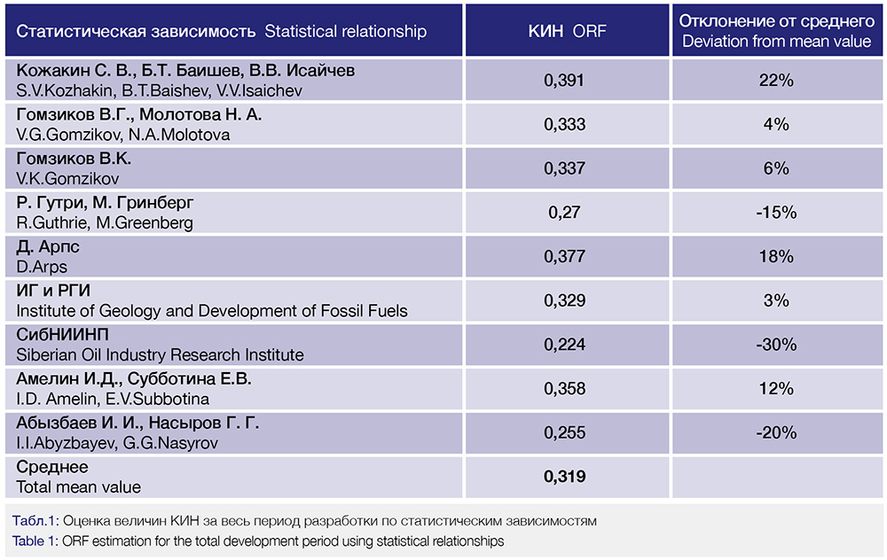 Для приведенных геолого-физических условий можно провести оценку КИН по статистическим зависимостям различных авторов (табл. 1):
