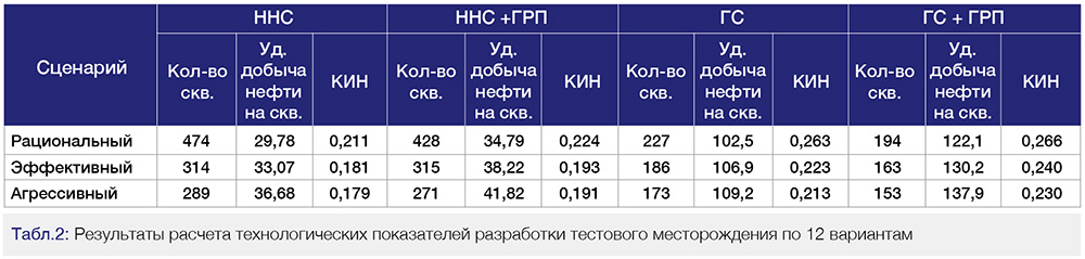 Максимальный КИН (за 25 лет) — 0,266 дол.ед., — получен для рационального сценария при разбуривании объекта горизонтальными скважинами с многостадийным ГРП, общим фондом 194 скважины, удельная добыча нефти за 25 лет составила 122 тыс.т., для агрессивного сценария общий фонд горизонтальных скважин с МГРП составил 153 ед. и удельная накопленная добыча нефти максимальная 138тыс.т. Таким образом, разброс величин КИН по сценариям и типам заканчивания имеет значения от минимального 0,179 до максимального 0,266. Максимальный КИН получен в рациональном варианте с горизонтальными скважинами с МГРП, а максимальная удельная добыча нефти на скважину получена при агрессивном варианте с горизонтальными скважинами с МГРП
