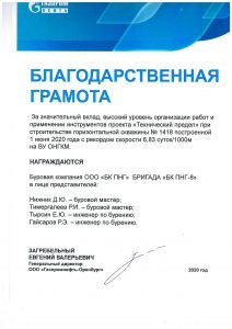 Буровая Компания ПНГ награждена благодарственной грамотой ООО «Газпромнефть-Оренбург»