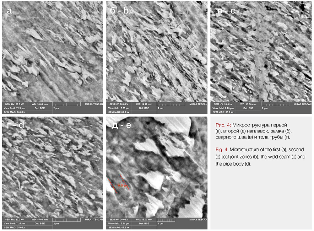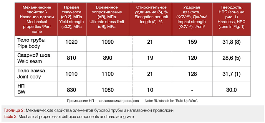 Для определения механических свойств материала бурильной трубы высаженной части, сварного шва, наплавки и основного материала трубы проведены испытания на растяжение продольных пятикратных образцов типа III № 7 на разрывной машине УЭМ-10Т при комнатной температуре, скорости нагружения 5 мм/мин и масштабе записи 25 в соответствии с ГОСТ 1497-84 с учетом требований ASTM A370, испытания ударной вязкости стандартных образцов типа 11 при температуре +20ОС на маятниковом копре КМ-30 в соответствии с ГОСТ 9454-78 с учетом требований ASTM E23; измерение твердости по методу Бринелля в соответствии с ГОСТ 9012-59, по Роквеллу вдавливанием конуса, ГОСТ 9013-59, и микротвердости на приборе ПМТ-3 по ГОСТ 9450-71, металлографический анализ — на Neophot-32 и на цифровом инвертированном микроскопе Zeiss Axiovert 40MA, электронно-микроскопический анализ на Hitachi S-3400N и Phenom Pro X.
