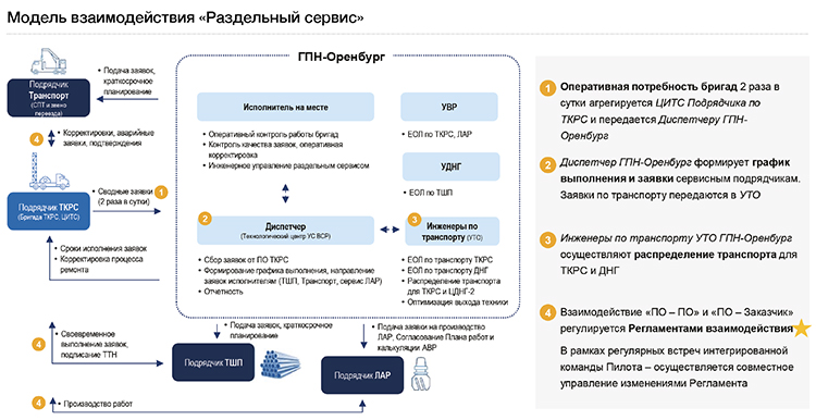 Стимулом для внедрения раздельного сервиса на месторождениях «Газпромнефть-Оренбурга» стало стремление к повышению эффективности и минимизации издержек, увеличению надежности. Топ-менеджмент «Газпромнефть-Оренбурга» провел большую работу по изменению подхода к ремонту скважин в абсолютно новом виде, оценив при этом все риски перехода на новую модель, как финансовые, так и технологические. Был проведен ряд встреч с участием руководства компании и сервисных организаций, сформировали кросс-функциональную команду, вместе выработали стратегию и разработали оптимальную модель в тесном взаимодействии с контрагентами по принципам подхода «win-win».