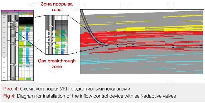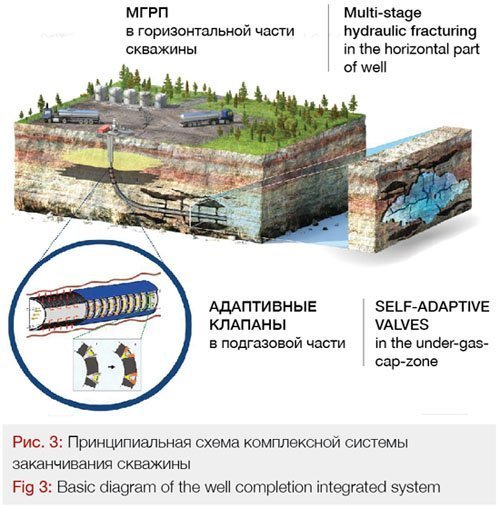 Для решения проблемы раннего прорыва нецелевого флюида и эффективной выработки подгазовой части пласта предлагается использование комплексной системы заканчивания скважин, которая позволит вовлечь в разработку весь интервал нефтенасыщенного коллектора. Такая система состоит из двух основных технологий: исследования притока с помощью устройства контроля притока (УКП) с адаптивными клапанами и МГРП (рис. 3).