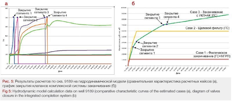 Из рис. 5 видно, что вариант фактического заканчивания показывает наихудшие результаты, так как коллектор в нижнем прослое относительно хуже коллектора в подгазовой зоне. ГС с обычным фильтром в первый год работы – наилучший результат, но скважина также закрывается из-за прорыва газа. Предлагаемая адаптивная система позволяет отбирать меньше газа, при этом разрабатывая подгазовую нефтяную часть.