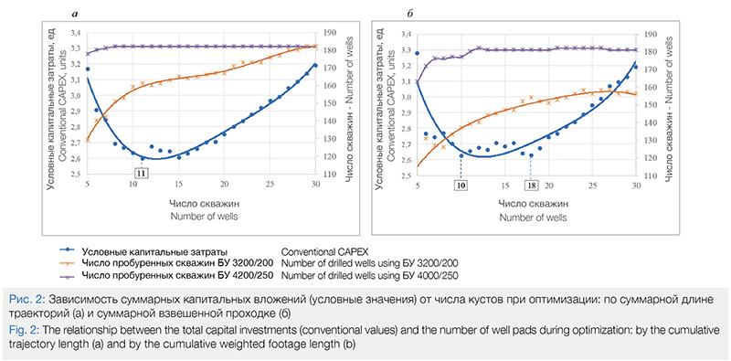 При оптимизации по суммарной длине траектории минимум капитальных вложений достигается при формировании 11 кустов скважин в (рис. 2, а), по взвешенной проходке – 10 или 18 кустов (рис. 2, б). В первом случае буровой установкой БУ 4000/250 можно пробурить все проектные скважины при формировании более 6 кустов, во втором – при формировании более 11 кустов, поэтому более приемлемым является вариант с 18 кустами (рис. 18,б).