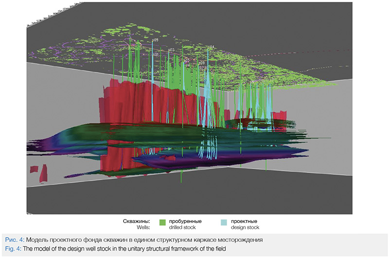 Такая детализация позволяет максимально приблизить результаты проектирования к реальным условиям. Структурные поверхности дают возможность определить точки пересечения проектных скважин с транзитными объектами эксплуатации, сместить их при необходимости, сформировать систему разработки с использованием транзитного фонда скважин с учётом режима их работы (добыча, нагнетание). Наличие разломной модели наглядно показывает прохождение траекторий скважин через структурные нарушения, и в зависимости от проницаемости разлома принимается решение о необходимости смещения ствола скважины.