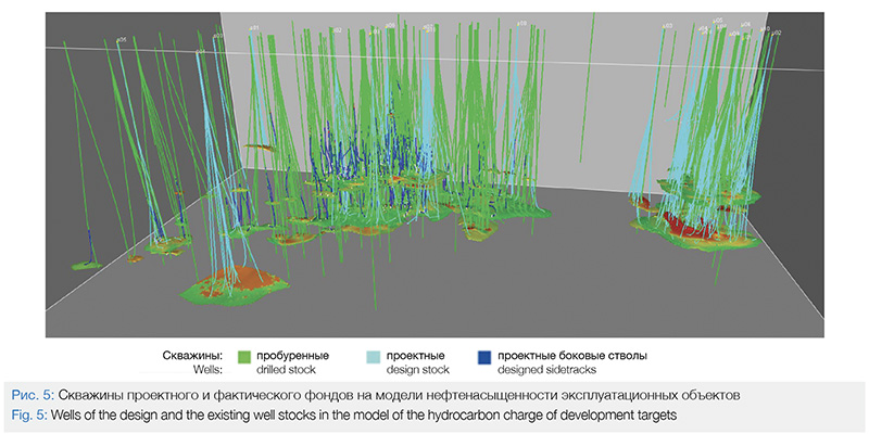 На рис. 4 представлен структурный каркас месторождения с картой топографии и наземной инфраструктуры (дороги, трубопроводы, строения, кустовые площадки, реки водоёмы). Такая информация даёт возможность уточнить положение кустов относительно природных препятствий, объектов инфраструктуры, зон с экологическими ограничениями. На рис. 5 показано размещение фактического и проектного фондов скважин с боковыми стволами на модели нефтенасыщенности эксплуатационных объектов.