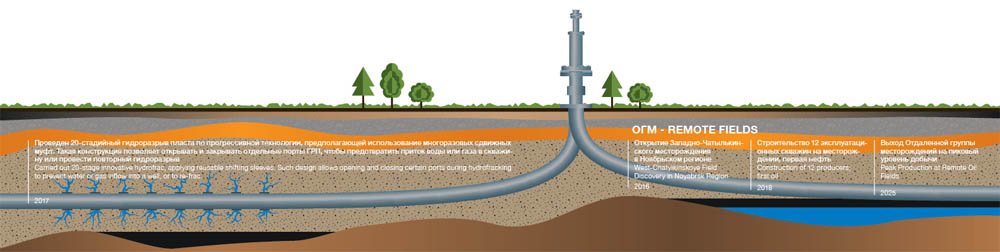 Открытие существенно изменило ситуацию на всем активе: синергетический эффект от создания общей инфраструктуры позволит ввести в разработку прежде нерентабельные запасы. В результате пиковая добыча проекта ОГМ может составить здесь около 3 млн тонн нефти в год. Большим преимуществом станет и скорость ввода этих запасов: первая нефть на вновь открытом месторождении начнет добываться уже в 2018 году, а в 2023 году оно выйдет на этап промышленной эксплуатации.