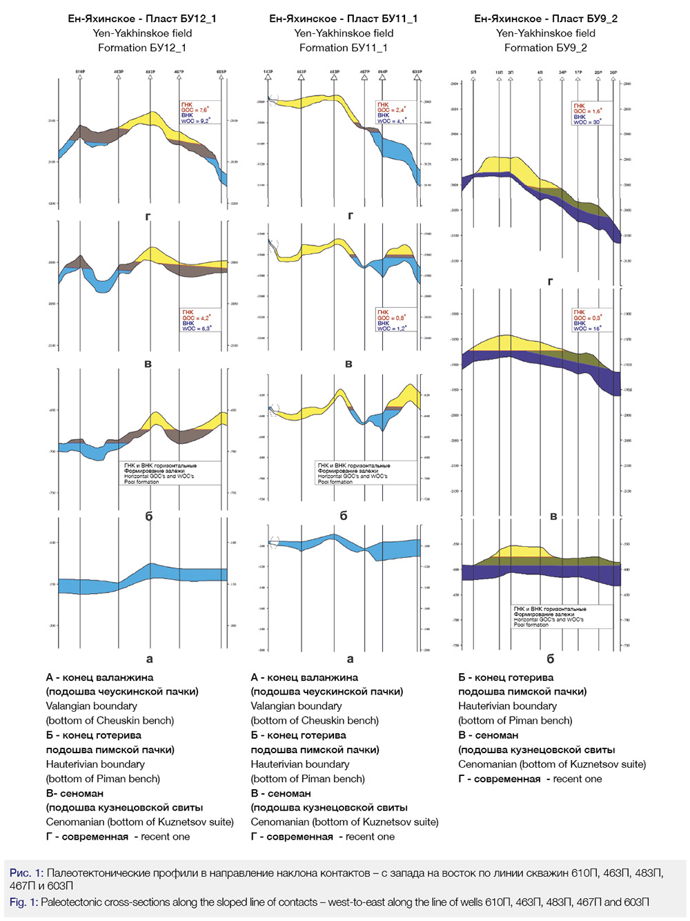 Оценивая степень влияния тектонического фактора, отметим, что, по мнению большинства исследователей, современные залежи УВ начали формироваться уже в нижнемеловое время и в более ранние периоды претерпевали различные трансформации, вслед за меняющимися тектоническими условиями района. Для изучения истории образования и переформирования залежей в пласте БУ121 Ен-Яхинского месторождения нами построены палеопрофили в направление наклона контактов – с запада на восток по линии скважин 610П, 463П, 483П, 467П и 603П (Рис. 1).