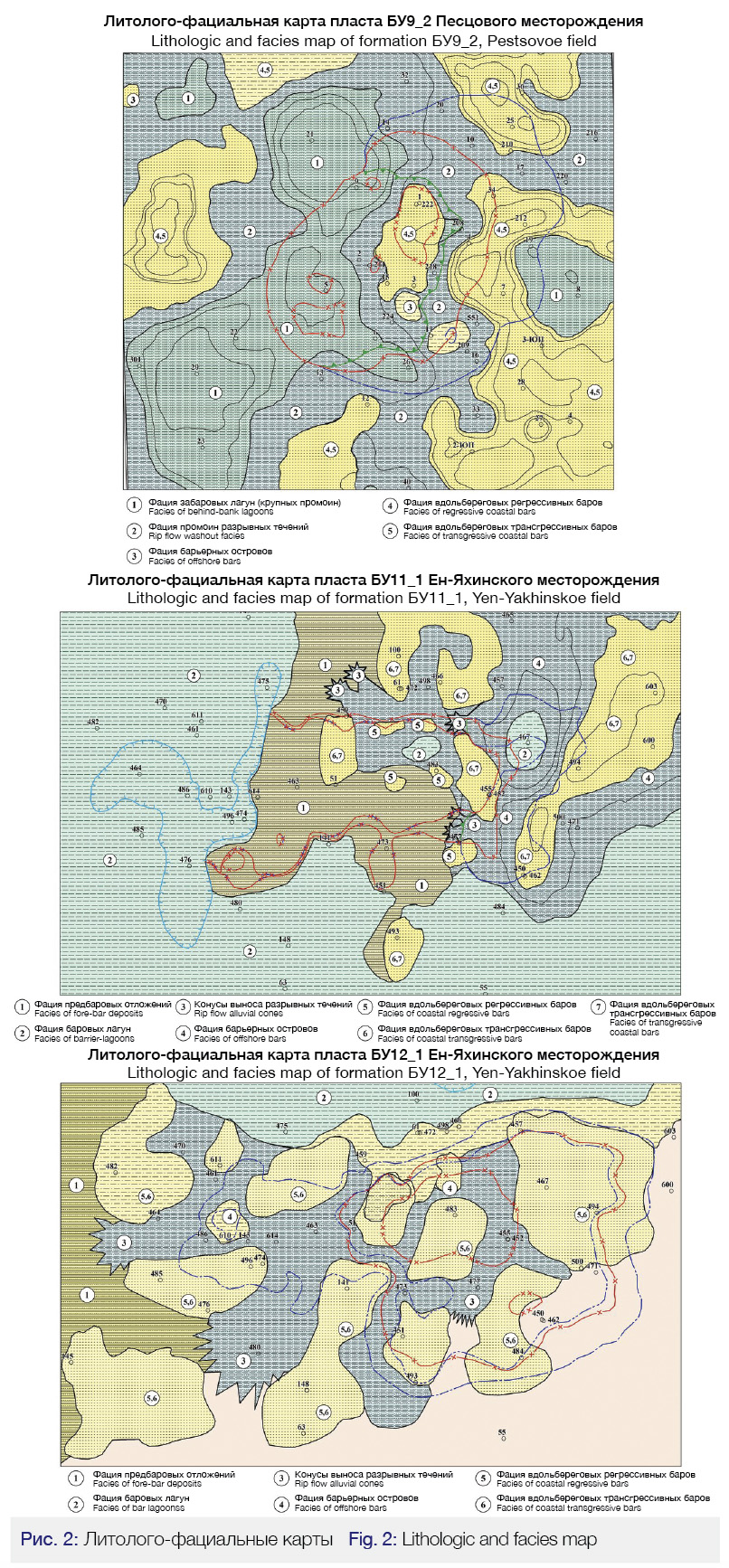 Как видно на представленных картах, пласт БУ111 характеризуется резкой литолого-фациальной изменчивостью, имеющей четкую субмеридиональную направленность. На пути миграции УВ из восточного купола фации вдольбереговых баров, выделяемые в районе скважин 603Р, 494Р, сменяются фациями разрывных течений, фациями глубоководных промоин и, наконец, фациями предбаровых отложений. Соответственно изменению фациальной обстановки, в направление с востока на запад  резко ухудшаются емкостно-фильтрационные свойства пласта (Рис. 2), вплоть до полной глинизации.