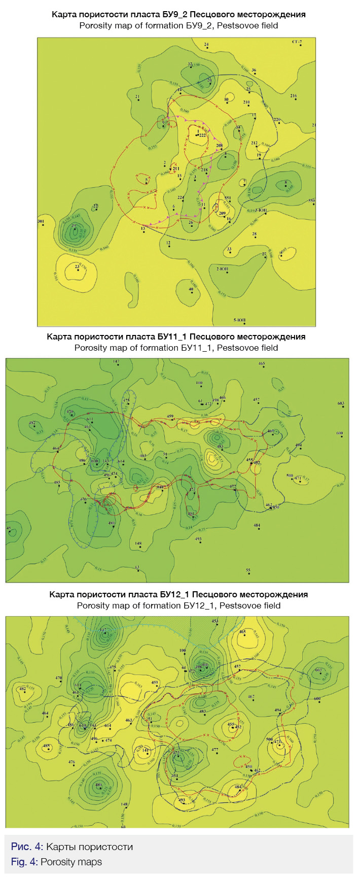 В последующее геологическое время наблюдается рост центрального купола и интенсивное опускание и выполаживание восточного купола, вплоть до его полного раскрытия, что вызвало переток УВ флюидов вверх по восстанию слоев в центральный купол, емкость которого увеличивалась за счет воздымания западного крыла. Содержавшаяся в палеозалежи восточного купола нефть мигрировала вверх по восстанию слоев и этот процесс так же полностью зависел от внутреннего строения и неоднородности емкостно-фильтрационных свойств пласта. Для изучения этих факторов, определяющих динамику миграции УВ, построена литолого-фациальная карта пласта БУ111 (Рис. 2), а также карта пористости коллекторов (Рис. 4).