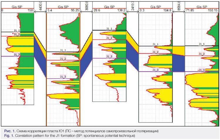 Для построения модели пласта была привлечена информация по 3D сейсмическому кубу данных, полученных в 2006 г. и переобработанных в 2017 г. с использованием новых программных продуктов. Задача, поставленная перед группой обработки, заключалась в достижении оптимальной детализации волновой картины в интервале разреза юрских отложений. Сохранение динамического диапазона сейсмической записи, необходимого для проведения анализа атрибутов, также являлось критерием для оценки качества обработки. В результате качество полученного куба позволило выполнить намеченные задачи. На сейсмическом разрезе после переобработки динамика отражений имеет различную интенсивность. Динамические параметры волнового поля определяются акустическими свойствами пород, следовательно, исследования динамики дают представление о геологии объектов. При изучении изменчивости амплитудных параметров по латерали применялся комплексный подход, включающий детальный анализ скважинных данных. При этом была использована методика В.С. Муромцева [2], которая позволила по форме кривых ПС определить различия в условиях формирования пластов (рис. 3). Для создания единой геологической модели необходимо было установить общие закономерности в условиях осадконакопления по результатам сейсморазведки и скважинным данным. На основе их комплексного анализа выделены этапы формирования залежи, зоны различного генезиса, а также локальные объекты в пределах перспективных тел. Обозначен протяженный канал временного водотока субширотного простирания, наиболее перспективный для локализации скопления углеводородов.