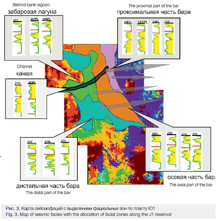 Фации меняются в западном направлении от проксимальной до осевой и дистальной частей бара. В западной части присутствуют лишь дистальные части бара, для которых характерно уменьшение толщин и ухудшение ФЕС пласта. Подобная зональность наблюдается на слайсах по времени ±10 мс относительно ОГ Ю1. Из их рассмотрения следует, что формирование залежи происходило в несколько этапов.