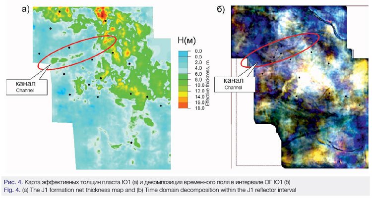 Для понимания истории формирования залежей необходимо также изучение карт изохор между сейсмическими поверхностями, которые дают представление о латеральных неоднородностях и изменении конфигурации объектов в плане. На картах изохор выделяются зоны уменьшенных или увеличенных временных толщин, которые могут соответствовать изменениям общих или эффективных толщин пласта. Так, в восточной части площади выделяется зона уменьшенных значений толщин между ОГ Б и Ю1, которая соответствует увеличенным толщинам пласта. В процессе анализа карт параметров было сделано предположение о наличии в области аномальных значений временных толщин канала, проходящего через залежь в направлении с востока на запад. Для более детального изучения области канала были рассчитаны карты сейсмофаций (см. рис. 3), основанные на анализе изменения формы сейсмических трасс по площади. Близкие по форме трассы группируются в классы, переход от одного класса к другому фиксируется как возможное изменение геологических характеристик объекта. На карте сейсмофаций в интервале ОГ Ю1 также выявлена аномальная зона, вытянутая в том же направлении, что и на карте изохор. Предполагая, что влияние геологических факторов, таких как изменение литологии и толщины пласта, на форму сейсмотрассы является определяющим, можно говорить о фациальной изменчивости строения залежи по площади и распределении классов сейсмических фаций. На карте толщин (рис. 4, а) отчетливо виден канал (узкая зона, расположенная в центральной части площади), протянувшийся с северо-востока на юго-запад. Направление канала также просматривается на карте RGB спектральной декомпозиции (рис. 4, б).
