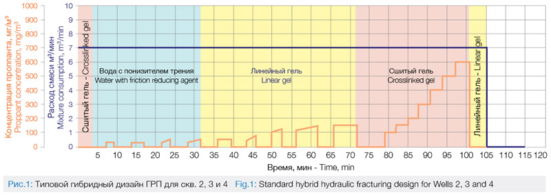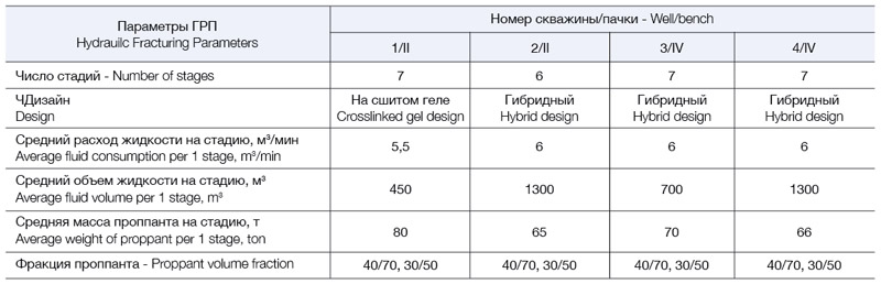 По результатам ретроспективного анализа были выделены два основных дизайна ГРП, применяемых в скважинах баженовской свиты: на гибридной системе жидкости и на сшитом геле. На опытно-промышленном участке месторождения Х пробурены скважины, вскрывающие продуктивные интервалы баженовской свиты. Во всех скважинах реализованы