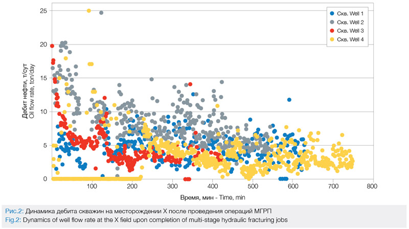 – наполнение трещин проппантом малой концентрации, что в процессе работы скважины снижает ширину и проводимость трещины до нулевых значений; – разрушение и вдавливание проппанта в стенки трещины вследствие его низкой концентрации. Анализ значений стартовых дебитов, а также тренда их падения показал, что скв. 4 и 1 имеют схожие стартовые дебиты и накопленную добычу (рис. 2). У скв. 4 стартовый дебит выше, но в процессе отбора жидкости произошло его быстрое падение. Одной из причин является потеря части SRV из-за смыкания незакрепленных трещин либо трещин, с малой концентрацией проппанта по причине его вдавливания в стенки трещины ГРП. Скв. 1 имеет меньший стартовый дебит, однако текущий дебит стабилен в течение почти 2 лет. МГРП в данной скважине проведен на сшитом геле, что приводит к формированию преимущественно планарных трещин. Скв. 2 и 3 характеризуются более высокими стартовыми и текущими дебитами, а также