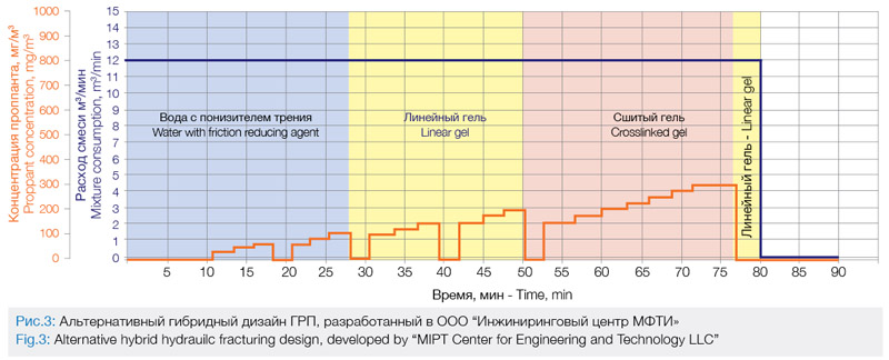 более высокой накопленной добычей. В скв. 3 использовано меньше жидкости ГРП при неизменной средней массе проппанта, т.е. создана сеть трещин с повышенной концентрацией проппанта. Вследствие этого проводимость трещин в процессе работы снижается менее значительно. В скв. 2 ситуация схожа с ситуацией в скв. 4. Аналогичный дизайн закачки позволил добиться максимального стартового дебита (около 20 т/сут), однако в дальнейшим произошло его резкое падение. С учетом накопленного опыта проведения гидроразрыва пластов баженовской свиты, анализа работы скважин после ГРП, геолого-геомеханических факторов (неоднородное поле напряжений, карта естественной трещиноватости в окрестностях скважины, 1D геомеханическая модель для каждой стадии), а также мирового опыта разработки сланцевых залежей специалистами Инжиниронгового центра МФТИ и Технологического центра «Бажен» для условий баженовской свиты разработан альтернативный дизайн МГРП (рис. 3).