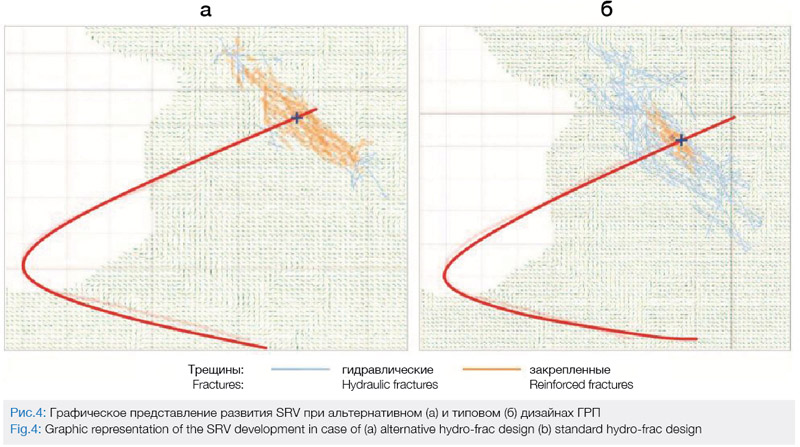 Он представляет собой гибридный ГРП, включающий три различных типа жидкости: воду с понизителем трения, линейный и сшитый гели. Во избежание деградации сети трещин снижен общий объем жидкости за счет уменьшения объема жидкости продавки между слаговыми пачками. Использование большой доли маловязкой жидкости способствует более активному формированию сети трещин. Для наиболее равномерного закрепления сформированной сети трещин предлагается закачка проппантных пачек с постепенным увеличением концентрации проппанта, что способствует закреплению более мелких и удаленных трещин в отличие от типового дизайна ГРП. Также пошаговое увеличение концентрации проппанта способствует увеличению проводимости трещин по мере приближения удаленной стимулированной зоны пласта к призабойной. Для переноса проппанта в маловязкой жидкости одним из главных факторов является использование высокорасходного флота ГРП. В данном случае высокий расход служит для поддержания раскрытия системы трещин и компенсации утечек при активации трещиноватости. Использование относительно небольшого объема сшитой жидкости обеспечивает формирование трещин в продуктивном интервале баженовской свиты. Снижение доли сшитого геля обеспечивает минимальное загрязнение трещины продуктами деструкции геля ГРП. По результатам моделирования (рис. 4) отмечается эффективное применение разработанного дизайна ГРП.