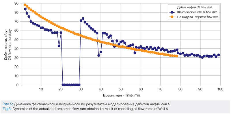 В ходе проведения операции ГРП в скв. 5 согласно утвержденному плану работ осложнений не возникло. На рис. 5 приведена динамика прогнозного и фактического дебитов нефти после вывода скв. 5 на режим. В уравнениях материального баланса при гидродинамическом моделировании учитывались объем закачанного.