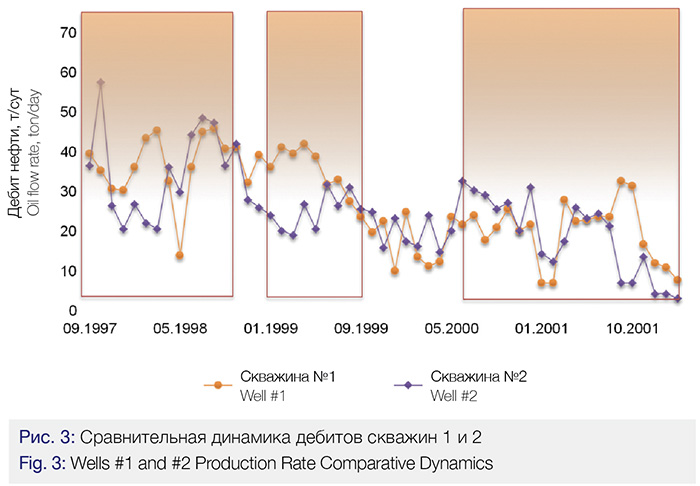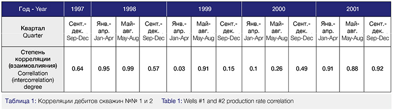 Данная зависимость хорошо прослеживается между скважинами № 1 и № 2. После ввода в эксплуатацию скважины № 2 в 1997 г. уже через месяц производительность соседней скважины № 1 упала. При этом дебит скважины № 2 резко увеличился. При увеличении дебита в скважине № 1, дебит в скважине 2 падает. В 2002 г. обе скважины по причине низкой продуктивности, связанной со снижением пластового давления, были остановлены (Рис.3, Табл.1).
