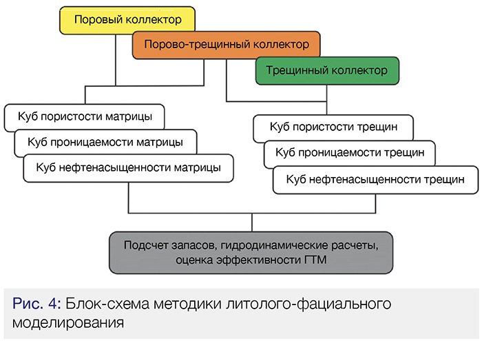 Литолого-фациальное моделирование при описании пустотного пространства в модели двойной пористости и двойной проницаемости осуществляется с учётом трёх типов коллекторов (поровый, трещинный, порово-трещинный) (Рис.4).