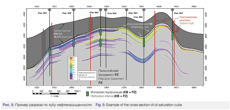 На рисунке 5 приведен разрез по общему кубу нефтенасыщенности коллекторов палеозойского фундамента, в котором учтена нефтенасыщенность каждой моделируемой среды (матрица и трещины).