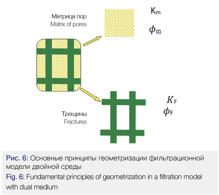 В системе с двойной пористостью большая часть углеводородов содержится в блоке матрице, а фильтрация к скважинам осуществляется через трещины с высокой проницаемостью [3].