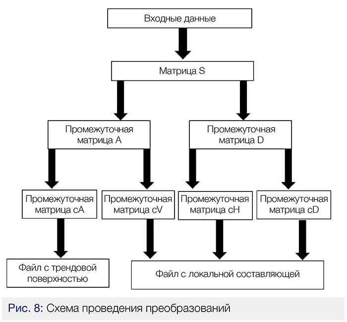 – матрица, значения элементов которой соответствуют значениям в узлах сеточной области гидродинамической модели, представляющей карту структурной поверхности пласта. Пусть по оси OX число узлов – N, по оси OY – M. В результате получаем матрицы: cA – усредненные значения, исходной карты структурной поверхности, уточняющие коэффициенты: cV – «по вертикали»; cH – «по горизонтали»; cD – «по диагонали» [15].