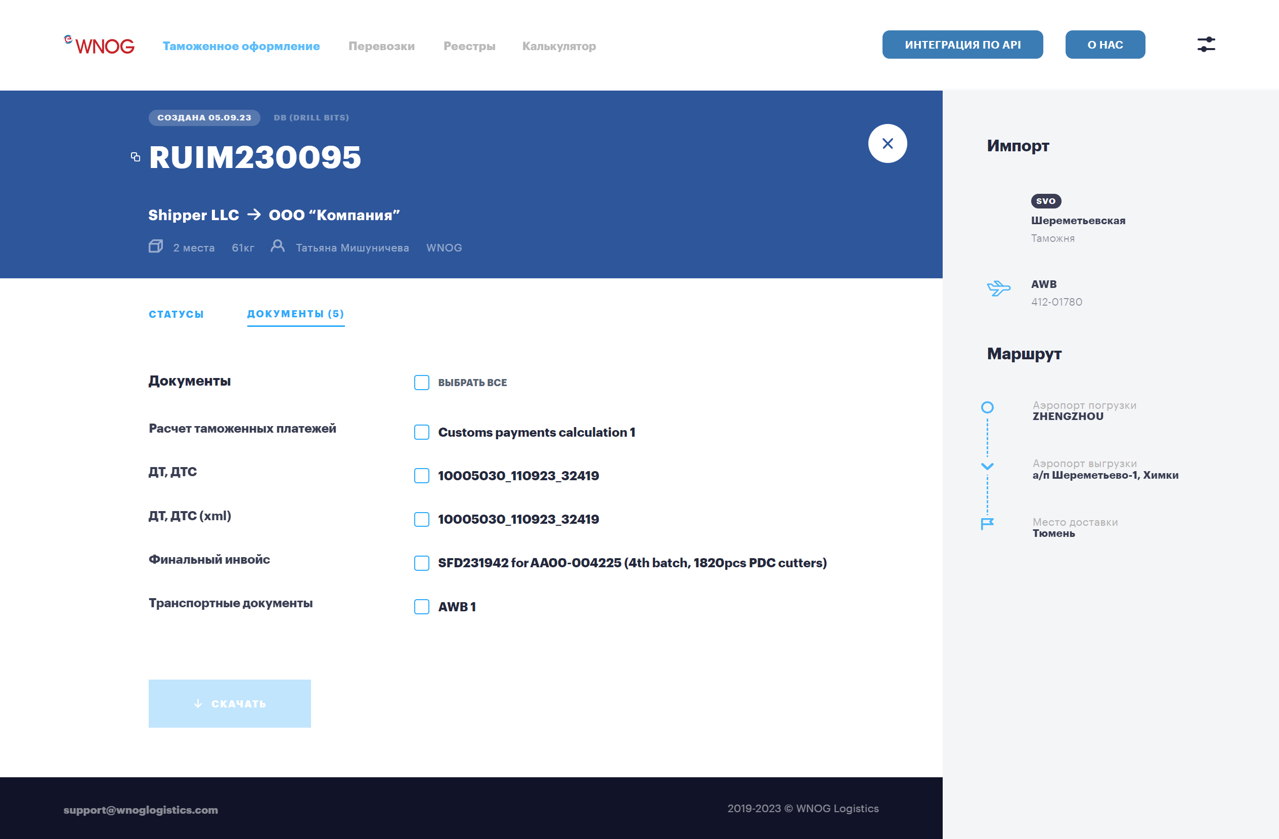 Мгновенный доступ к документам: клиенты могут легко загружать или получать необходимые транспортные и таможенные документы, обеспечивая безбумажный и эффективный процесс документирования.