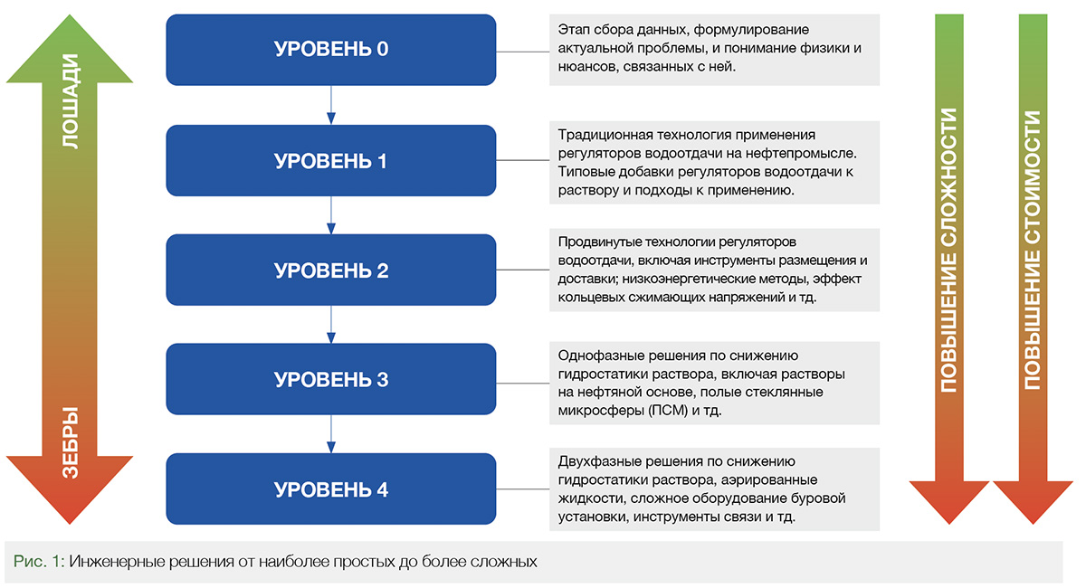 По мере продвижения программы бурения, проектная группа зарядила себя на успех, занявшись аспектами (УРОВЕНЬ 1) позволяющими анализировать, регулировать и измерять увеличивающиеся случаи потерь раствора во время операций бурения (Aлиев и др., 2017 г.). Подготовка включала в себя обеспечение доступа к традиционному набору регуляторов водоотделения (FLA) в удаленном районе с сезонной логистикой, что усложняло управление материально-техническим снабжением. В дополнение, внесение регуляторов (в связи с водоотдачей, проявлявшейся лишь в отдельных местах) являлось ключевой проблемой, и совместимость данного подхода с оборудованием для направленного бурения не всегда была очевидной. Циркуляционные переводники широко распространены по всей России, но периодически используя их, получаем отдельный вопрос по надежности и воспроизводимости результата. В результате ряда испытаний, после успешных операций, был выбран циркуляционный переводник SBD PBL. Использование данного инструмента вошло в норму, и это стало основой всего подхода с использование регуляторов водоотдачи. Данные методики борьбы с потерями раствора оказались более чем достаточными для зоны водонефтяного контакта (ВНК), пока бурились упрощенные горизонтальные скважины протяженностью от 750 до 1250 метров.