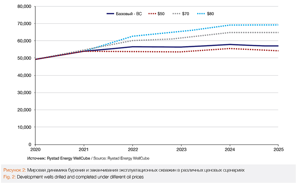 Рисунок 1 иллюстрирует динамику активности по бурению и заканчиванию эксплуатационных скважин до 2025 года в различных ценовых сценариях. В базовом сценарии, после очередного витка роста в следующем году, количество пробуренных и законченных скважин стабилизируется на уровне 57,000–58,000 скважин в 2022–2025 годах. В оптимистичном сценарии, предполагающим сохранение нефтяных котировок на уровне $80 за баррель на достаточно долгом промежутке времени, добывающие компании смогут пробурить дополнительно 40,000 скважин по сравнению с базовым прогнозом. Высокие цены на нефть неизбежно ведут к росту числа рентабельных проектов, что, в свою очередь, стимулирует рост буровой активности.