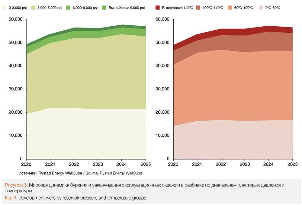 На рисунке 2 глобальное количество новых пробуренных и законченных эксплуатационных скважин разбито по показателям пластового давления и пластовой температуры, на которых эти скважины будут буриться и которые определяют их дизайн и конструкцию. Ожидается, что бо́льшая часть будущих скважин будут буриться на целевые объекты с пластовым давлением от 3,000 до 6,000 фунтов на квадратный дюйм (psi) и пластовой температурой от 60⁰ до 100⁰C. Менее 10% скважин будут пробурены до залежей с пластовым давлением, превышающим 10,000 psi; доминировать спрос на такие скважины будут Китай и США. Лишь 15% будущих скважин будут пробурены на залежи с пластовой температурой более 100⁰C.