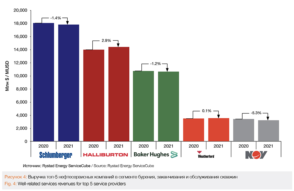 Крупнейшие нефтесервисные компании на международном рынке, Schlumberger, Halliburton и Baker Hughes, отчитались о существенном росте выручки в третьем квартале этого года (на 11% относительно первого квартала). Однако ожидается, что по итогам года доходы Schlumberger и Baker Hughes от услуг, связанных с бурением, заканчиванием и обслуживанием скважин, упадут на 1.3%. В случае Schlumberger, падение выручки главным образом обусловлено продажей ГРП бизнеса компании Liberty Oilfield Services в начале года. Несмотря на сокращение портфеля, Schlumberger остаётся лидером по абсолютным объёмам выручки от услуг по бурению, заканчиванию и обслуживанию скважин, ожидая получить в 2021 году $18 млрд. На рынки США, Саудовской Аравии и России придётся около половины доходов компании. Больше половины ожидаемой в этом году выручки Baker Hughes также приходится на рынки Северной Америки (в основном США) и Ближнего Востока.