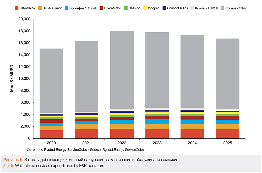 Rystad Energy ожидает, что за 2021-2025 года в услуги по бурению, заканчиванию и обслуживанию скважин операторами месторождений будет инвестировано $864 млрд. 40% этих инвестиций придутся на сегмент заканчивания скважин и ГТМ. За пять лет Северная Америка потратит на услуги по бурению, заканчиванию и обслуживанию скважин $65 млрд, Азия и Австралия — $29 млрд, Ближний Восток — $21 млрд.