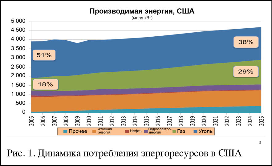 В течение последних 5-10 лет газовая промышленность в США испытывала настоящий бум. Благодаря своим обширным резервам и рыночной цене газ быстро становится наиболее предпочтительным энергоносителем. Как видно из рис. 1, природный газ существенно уступает углю по объему использования в качестве источника электроэнергии: в начале 2000-х годов угольная отрасль обеспечивала более 50 % производимой в стране электроэнергии, в то время как доля природного газа составляла менее 20%.