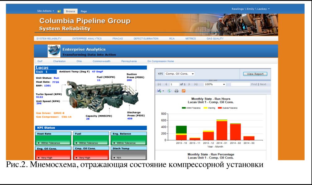 Компания CPG используют SharePoint в качестве единого портала для всей системы EA. На рис. 2 приведен пример мнемосхемы с двигателем одной из компрессорных установок в Огайо. Информационная панель отображает показания, с которыми специалисты CPG имели дело во время январского вихря. На экране представлено несколько различных визуальных компонентов: слева — изображение установки с различными телеметрическими показателями, такими как частота вращения турбины, давление всасывания и удельный расход теплоты. Вся эта информация слева поступает и обновляется в режиме реального времени. В нижней части мнемосхемы приводятся статусы KPI (ключевых показателей эффективности). Справа указано время наработки данной установки за период последних 6 мес. Таким образом, пользователю предоставляются несколько возможностей для принятия решения и входные данные, позволяющие получить представление о том, что происходит. Изменение цветовой гаммы на мнемосхеме отражает состояние агрегата в целом, привлекая внимание пользователя красным цветом в случае возникновения нештатных ситуаций.