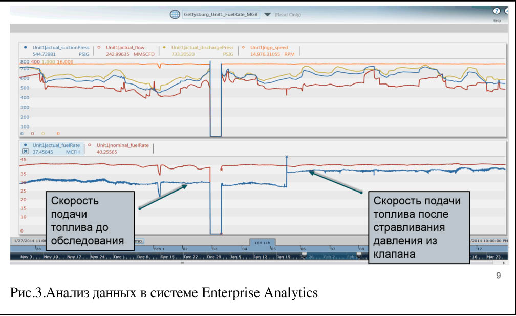 На рис. 3 представлен тренд, построенный в PI Coresight, отображающий реальную ситуацию, которая возникла на компрессорной станции компании CPG в Пенсильвании в январе 2014 г. во время полярного вихря. Один из операционных аналитиков, получив на электронную почту уведомление, заметил снижение скорости подачи топлива на одну из компрессорных установок, находившихся в его ведении. Он открыл PI Coresight и провел анализ графиков с параметрами скорости подачи топлива, потока, скорости и давления на всасе и нагнетании с целью поиска закономерностей. Аналитик отметил четыре разные точки PI Point и просмотрел данные в ретроспективе. Затем он связался со станцией и попросил провести обследование оборудования, после чего рабочие осмотрели объект и обнаружили подтекающий клапан. Как видно из графика, сразу после стравливания давления и замены клапана скорость подачи топлива пришла в норму.