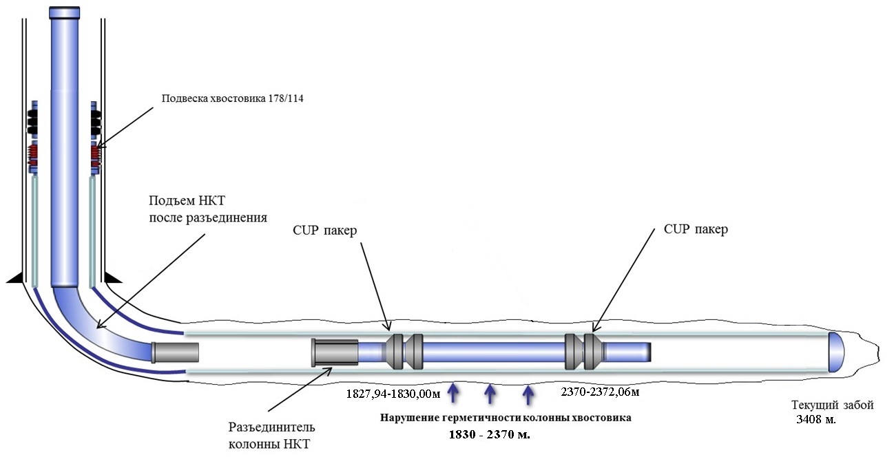 В условиях, когда нефтедобывающая отрасль сталкивается с необходимостью разработки сложных запасов и снижения себестоимости добычи, особую актуальность приобретают технологии, позволяющие эффективно бороться с обводнением скважин. Изоляция обводнившихся участков горизонтального ствола скважин является достаточно сложной задачей. Традиционное цементирование и обычные механические или гидромеханические изолирующие пакерные элементы в горизонтальных участках работают неэффективно, что ведет не к качественной изоляции водопритока. Набухающие пакерные элементы не могут быть легко извлечены после набухания. Наиболее оптимальным решением для изоляции горизонтальных интервалов является пакерный мост, успешно примененный на Северо-Комсомольском месторождении. Схема установки пакерного моста показана на Рис. 1.