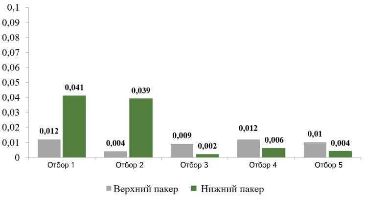 Лабораторный анализ проб, отобранных в 5 этапов, показал, что после первоначального выноса маркерного вещества, связанного с активацией системы, концентрация стабилизировалась на минимальном уровне (Рис. 2), свидетельствующем о протечке менее 1 м³/сут. Такая точность контроля стала возможной благодаря использованию высокочувствительного лабораторного оборудования с порогом обнаружения до 10⁻⁹ г/л.