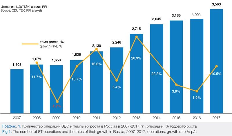 С 2007 года число операций ЗБС в России в основном росло. Всего за период 2007-2017 гг. количество операций такого рода увеличилось на 137%, с 1,5 тыс. до 3,6 тыс. в год. Годовые темпы роста количества операций ЗБС в этот период выросли с -1,7% в 2009-м до максимума в 20,9% в 2013 году (см. график 1).