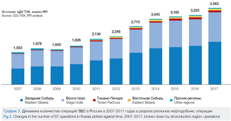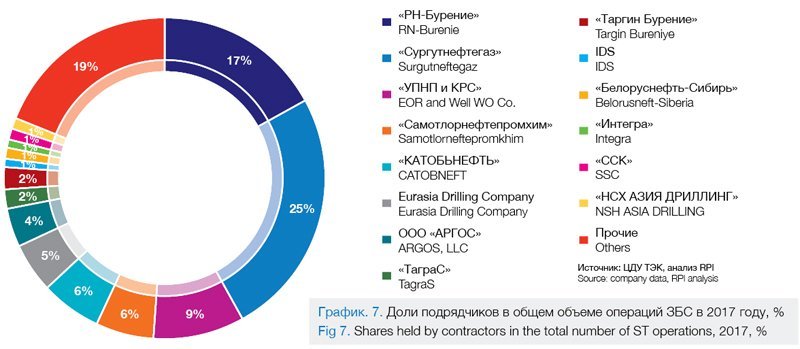 В 2017 году подрядные организации изменили объемы работ по бурению боковых стволов. Большая часть компаний увеличила количество ЗБС в соответствии со спросом на услуги, что и обеспечило в конечном итоге упомянутый выше общий рост рынка ЗБС на 10,5%.