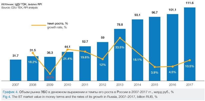 В 2007-2017 гг. рынок ЗБС рос и в денежном выражении, достигнув в 2017 году уровня в 111,6 млрд руб. Причем только в одном 2017 году рынок ЗБС увеличился на 10,6 млрд руб., продемонстрировав годовой темп прироста в 10,5% (см. график 4).