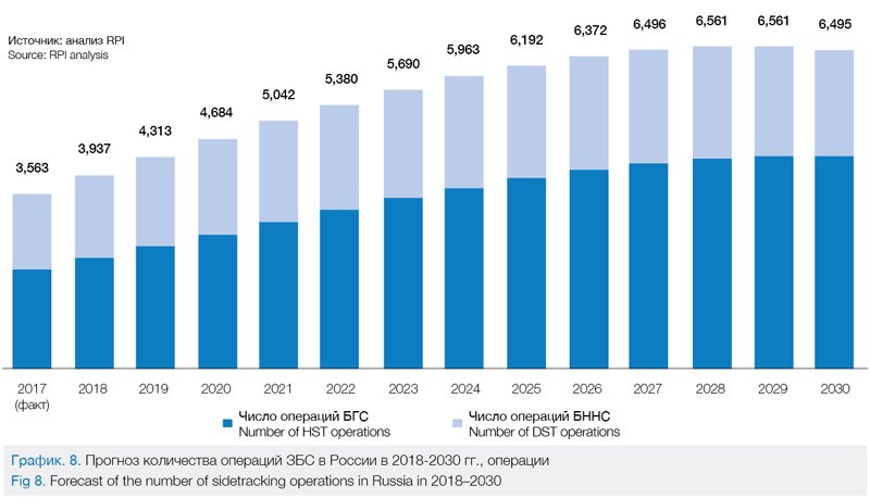 В настоящее время доля БГС в общем количестве операций, как уже указывалось ранее, составляет 56% в среднем по стране. Этот тип боковых стволов станет еще более распространенным, и его доля в строительстве ЗБС достигнет к 2030 году 65% (см. график 8).