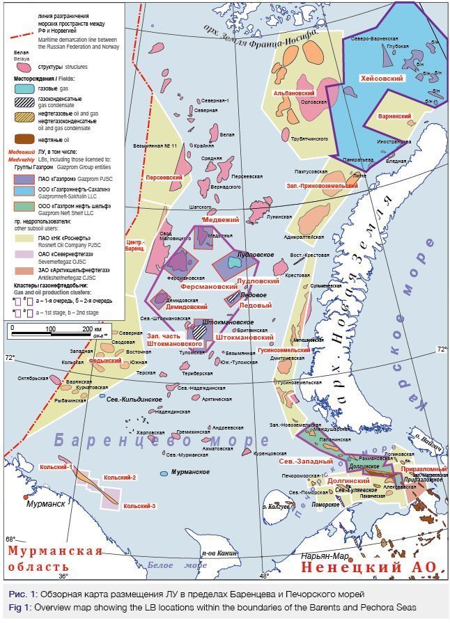 По состоянию на 01.07.2018 ПАО «Газпром» на баренцевоморском шельфе владеет лицензиями на 11 ЛУ (рис. 1), включая 3 участка на печорском шельфе.